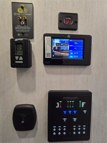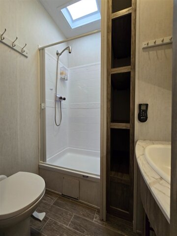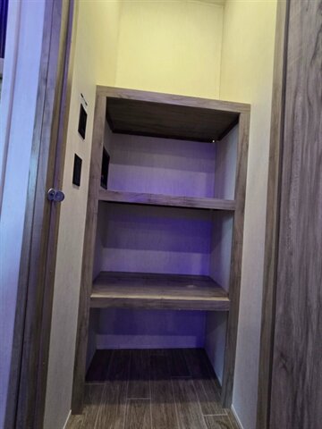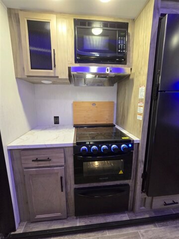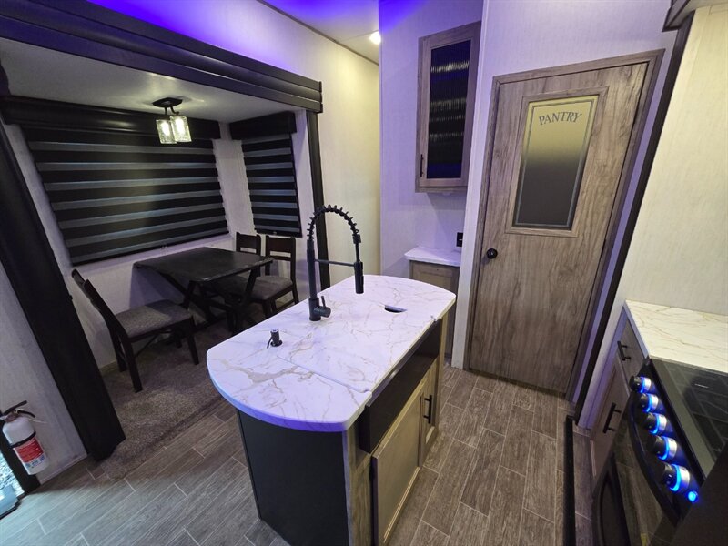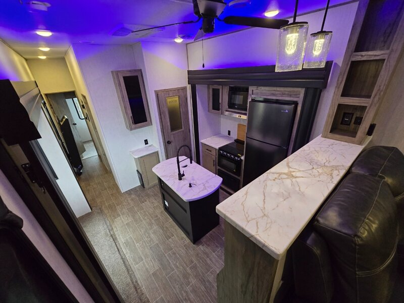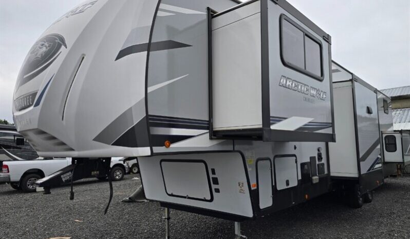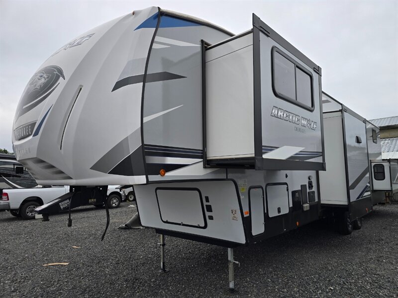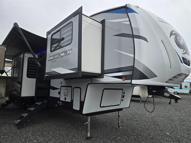 Step inside this Modern front living floor plan Arctic Wolf Limited with 5 slides. The upper living room features 2 trifold couches, a cozy fireplace, LED TV (to be installed) and comfy theater seating with LED lights and heating. This open floor plan overlooks the well equipped kitchen and dining area. Here you'll find a large refrigerator, microwave with hood, gas cooktop/ oven, spacious island, pantry and a nice dinette. Down the hall is a large high ceiling bathroom right beside the loft area. Just below is the master suite with King bed, built in chest of drawers, another LED TV (to be installed) and a large closet. Outside is plenty of storage, a large LED lit awning, Solar package and more. Financing now available too! Come see it today before it's gone!