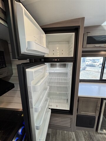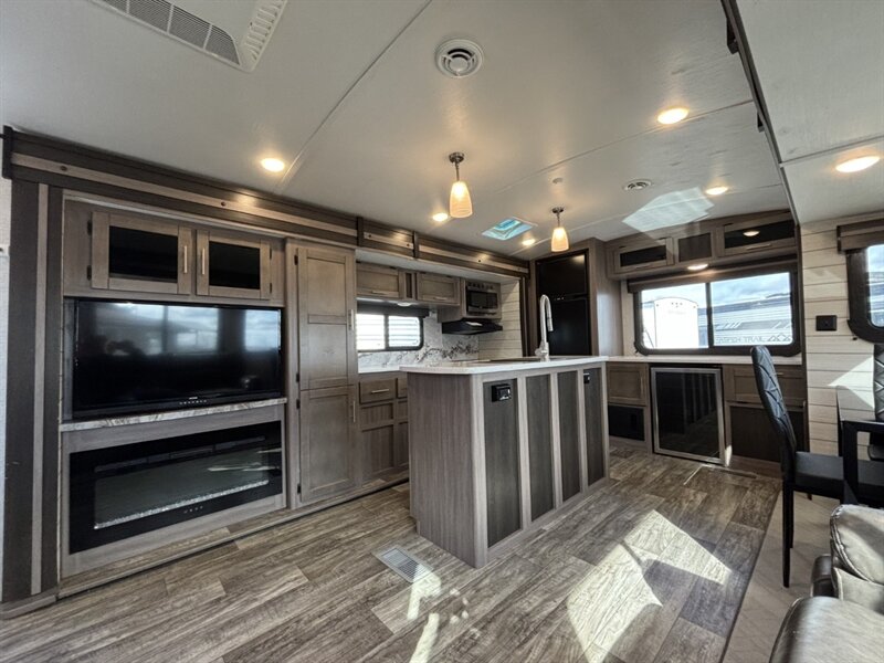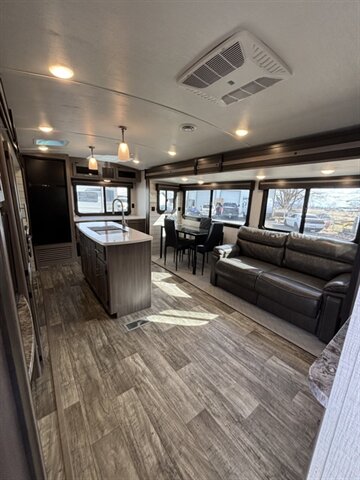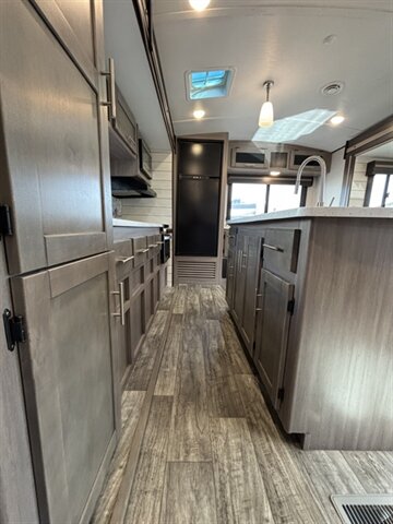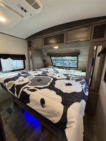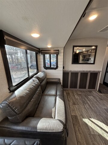 2022 Keystone SUNSET TRAIL 285CK — clean white exterior, modern gray interior, and in excellent overall condition. Factory-equipped with aerodynamic front cap, power awning with integrated LED lighting, exterior speakers and pass-through storage for easy gear access. Inside you’ll find comfortable gray upholstery, residential-style vinyl flooring, LED interior lighting, solid-surface countertops, stainless sink, a three-burner range with oven, microwave, and a 12V/120V refrigerator plus pantry space. The bedroom offers a king bed with wardrobe and under-bed storage; the bath includes a roomy shower with skylight and vanity. Standard comfort and convenience features include roof-mounted dual air conditioning, propane furnace, AM/FM Bluetooth stereo with LED TV , fresh/gray/black holding tanks with city water hookup, electric power systems and safety kit (smoke/CO/LP detectors, fire extinguisher) — everything you need for ready-to-go camping. Financing available. Trades considered. 7 day complimentary guarantee included